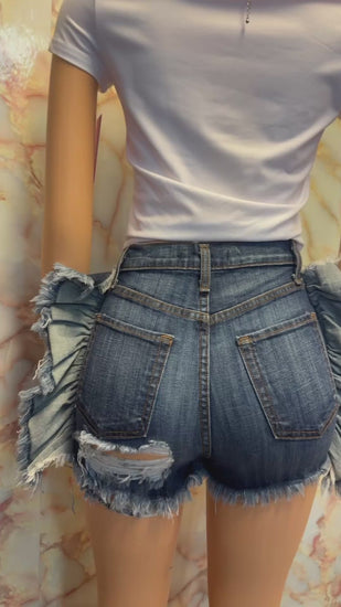 Medium denim ripped shorts with wings on side